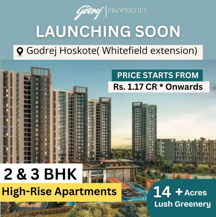 Godrej Parkshire Hoskote will be constructed on 13.5 Acres of land parcel, 5 Towers with Ground+28 Floors having 2BHK & 3BHK premium residences. Godrej New Launch Hoskote Project is located Off Old Madras Road, Dodda Amanikere, Hoskote, Bangalore with - Hoskote Toll Plaza - 4.3km, Orion Uptown Mall - 5.3km, MVJ Hospital - 5.9km. Godrej Hoskote New Project first is internal amenities - Vitrified tiles, Branded Fittings, Granite Kitchen, Power back...